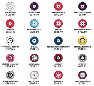 足坛可谓一片欣欣向荣,二十强总营收达124亿欧元,较去年增长11%。